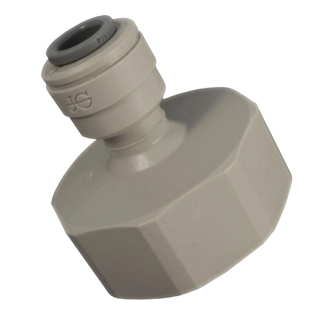 Tap adaptor, which is produced in a grey acetal copolymer making it especially suitable for applications involving foodstuffs and potable liquids.