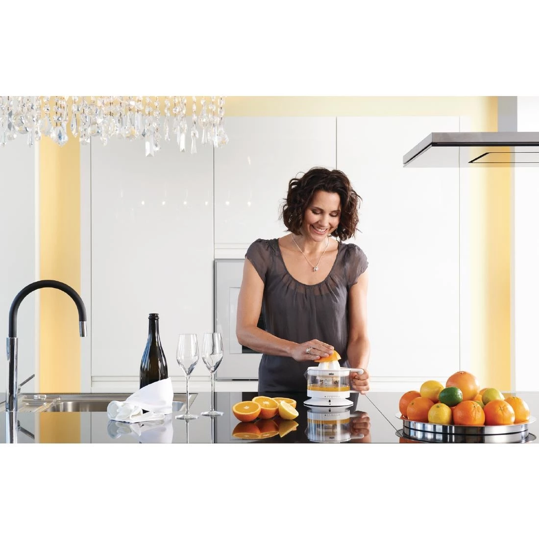 - Easy to use: automatic start/stop with no additional buttons – simply press down on the fruit to start and lift off to stop