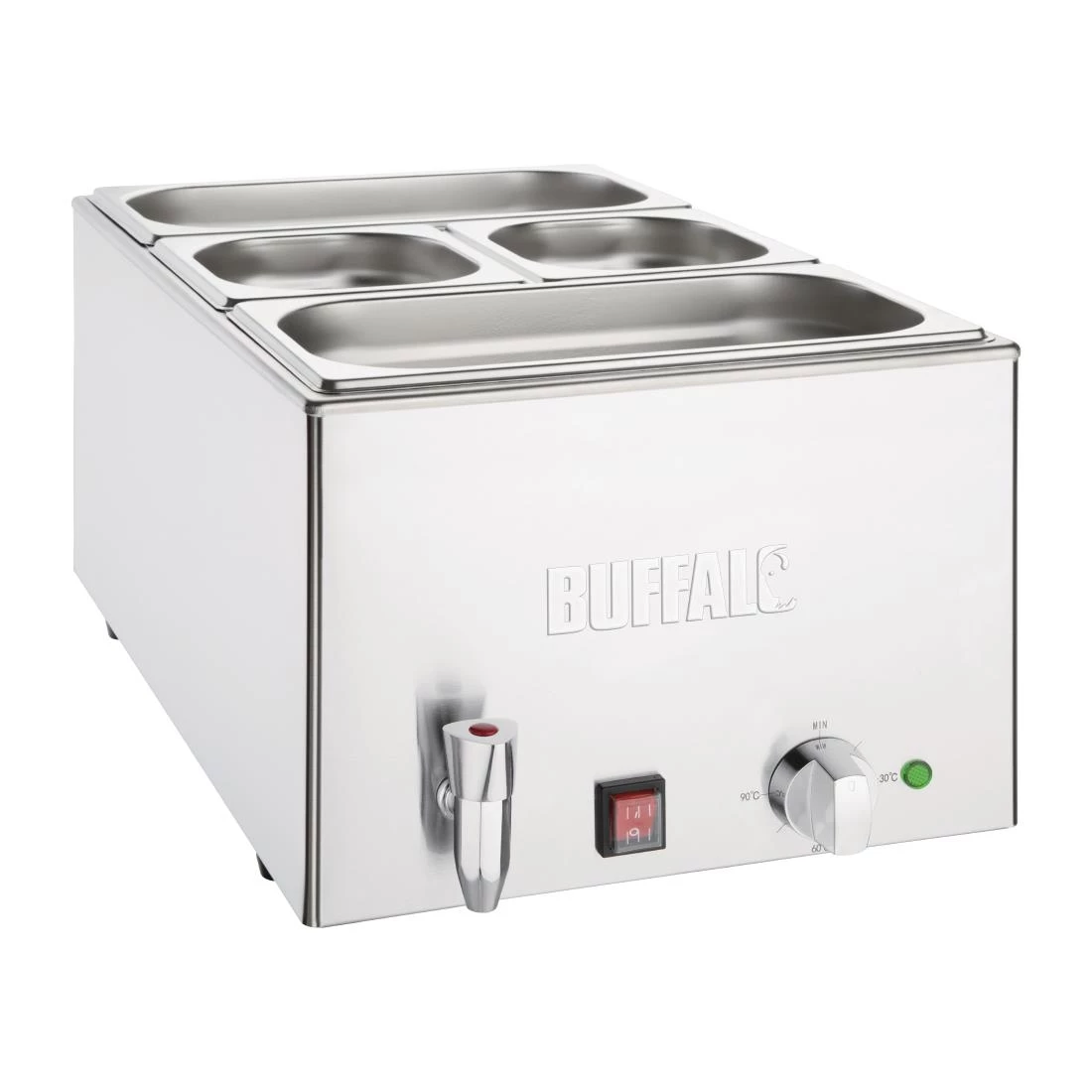 Perfect for the busy commercial kitchen or self-service buffet, the Buffalo bain marie makes it easy to stylishly keep food warm. Supplied with two 1/3rd size and two 1/6th size gastronorm pans and lids, the Buffalo bain marie is ideal for holding a huge variety of pre-cooked foods such as beans, chilli or gravy at a safe serving temperature.