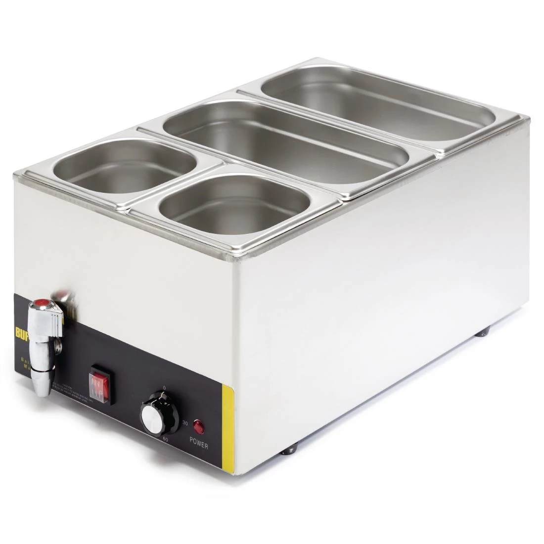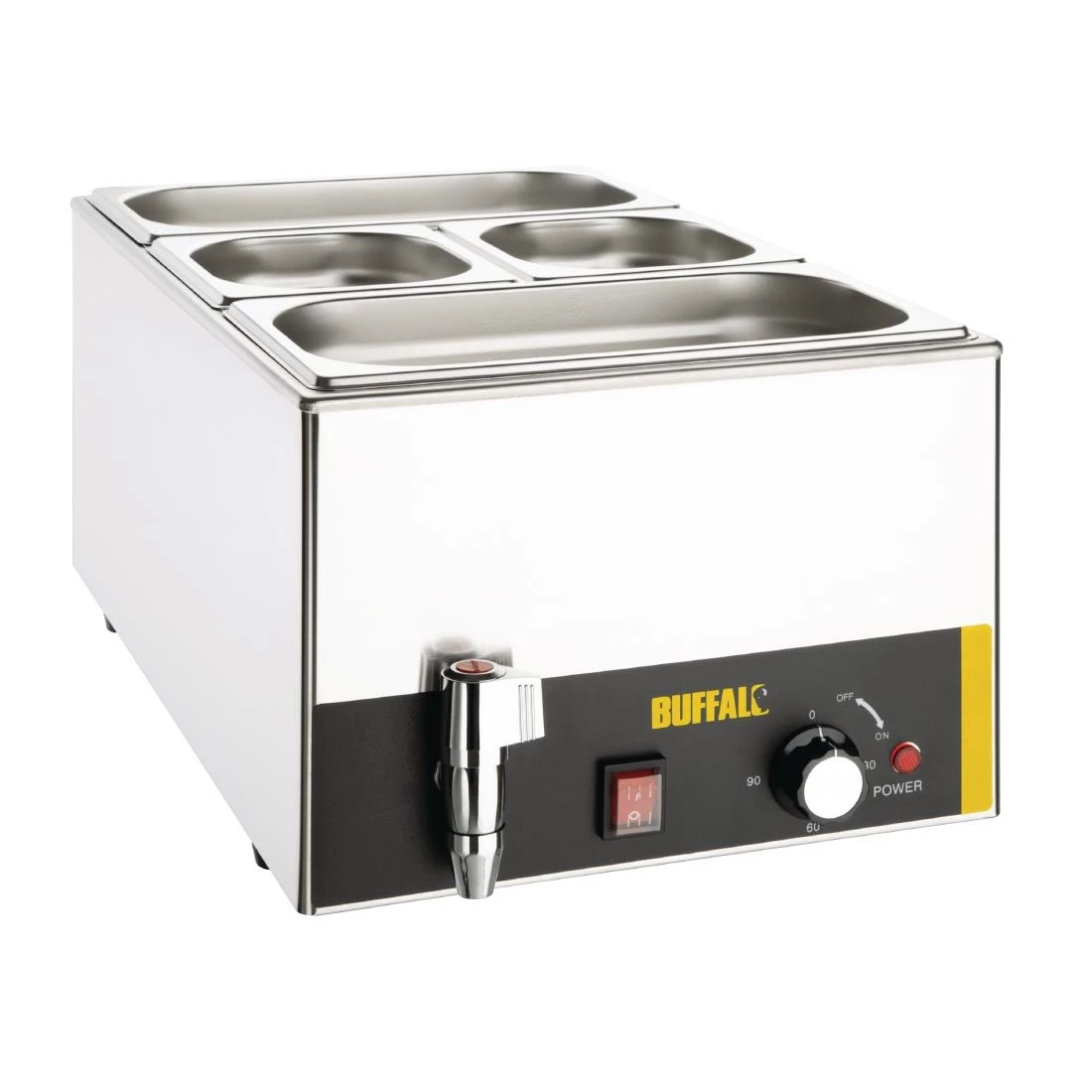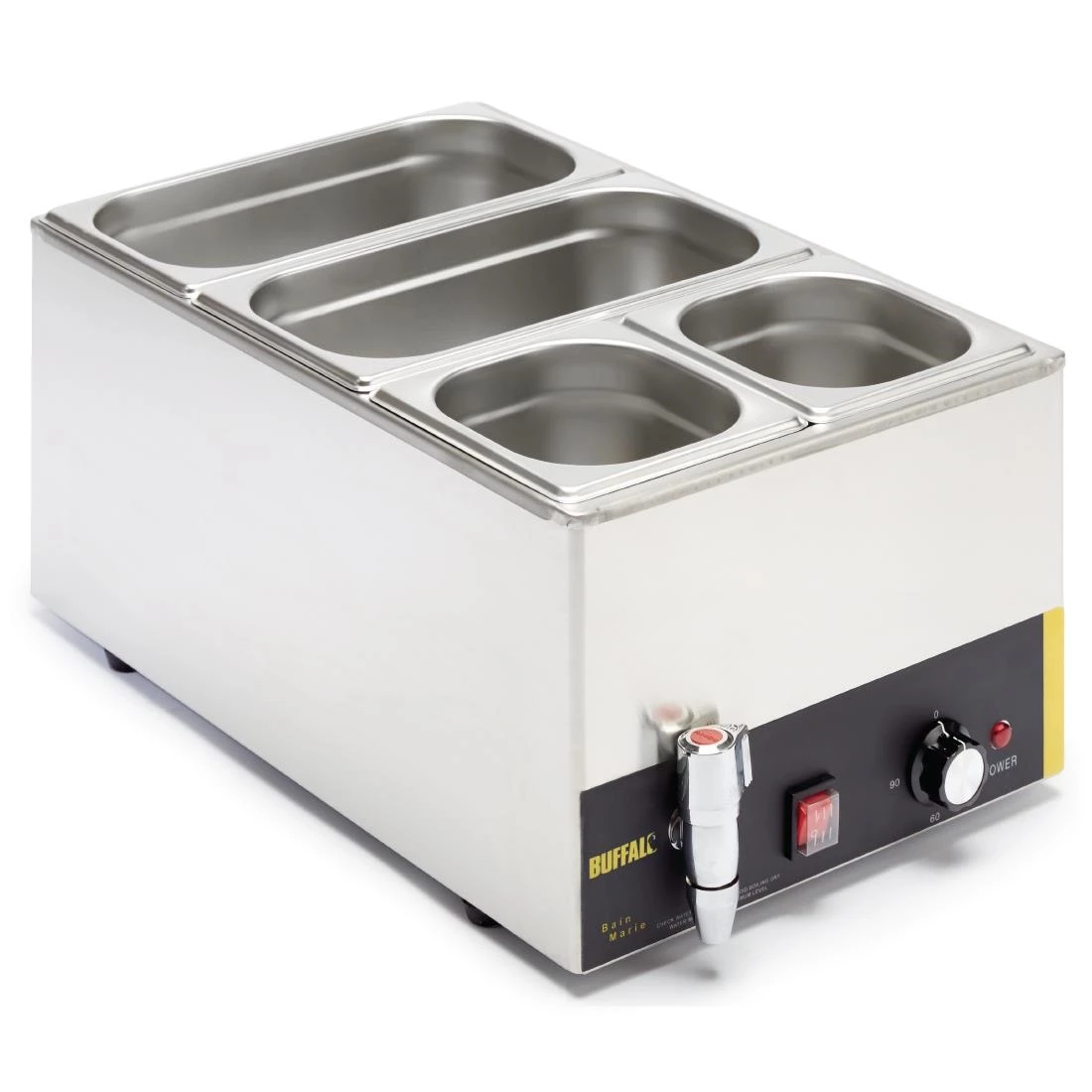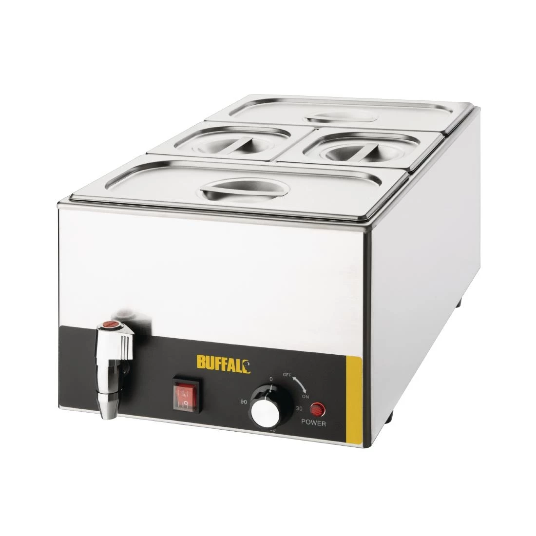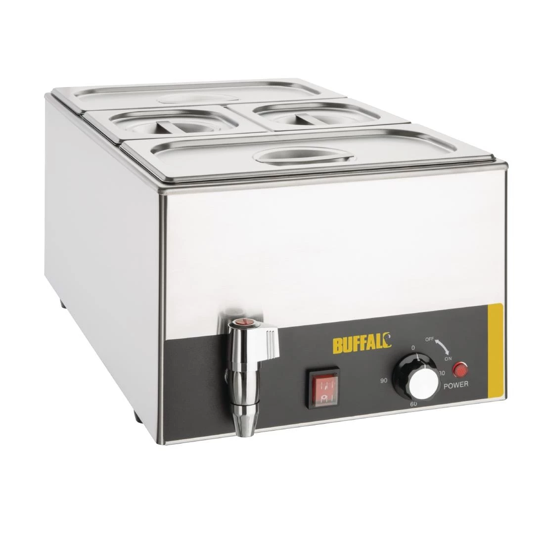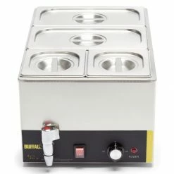 Perfect for any commercial kitchen or buffet, the Buffalo bain marie makes it easy to stylishly keep food warm. Supplied with two 1/3rd size and two 1/6th size gastronorm pans and lids, the Buffalo bain marie is ideal for holding a huge variety of pre-cooked foods such as beans, chilli or gravy at a safe serving temperature. Once service is over, the bain marie is incredibly easy to clean and drain, thanks to stainless steel construction and the handy front-mounted water drainage tap.