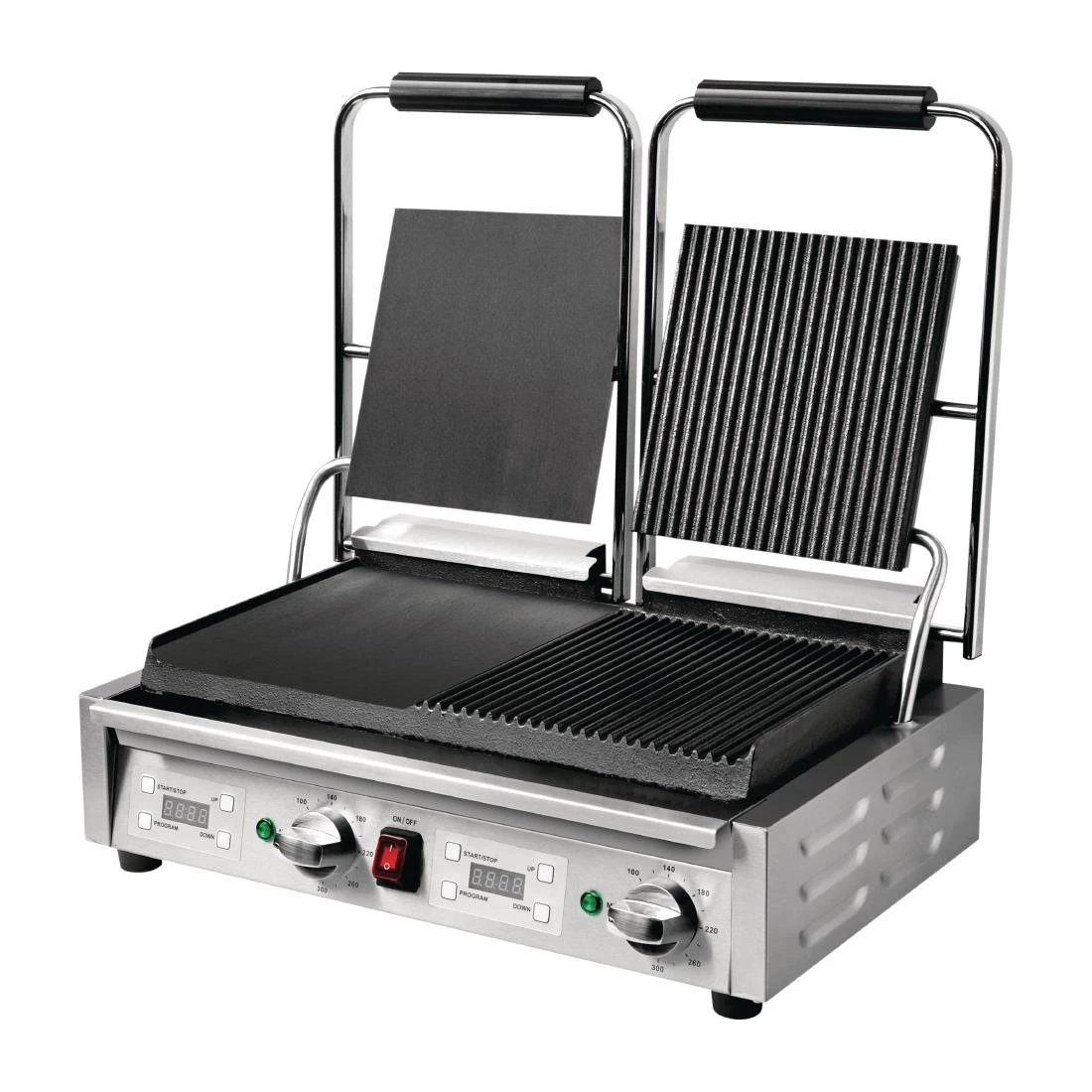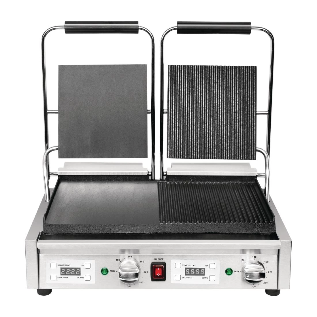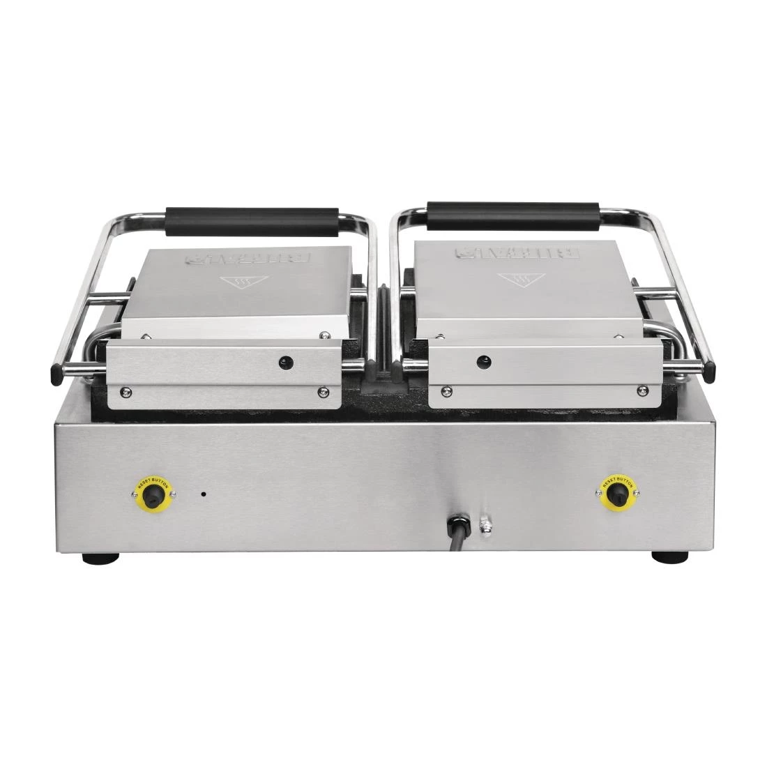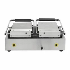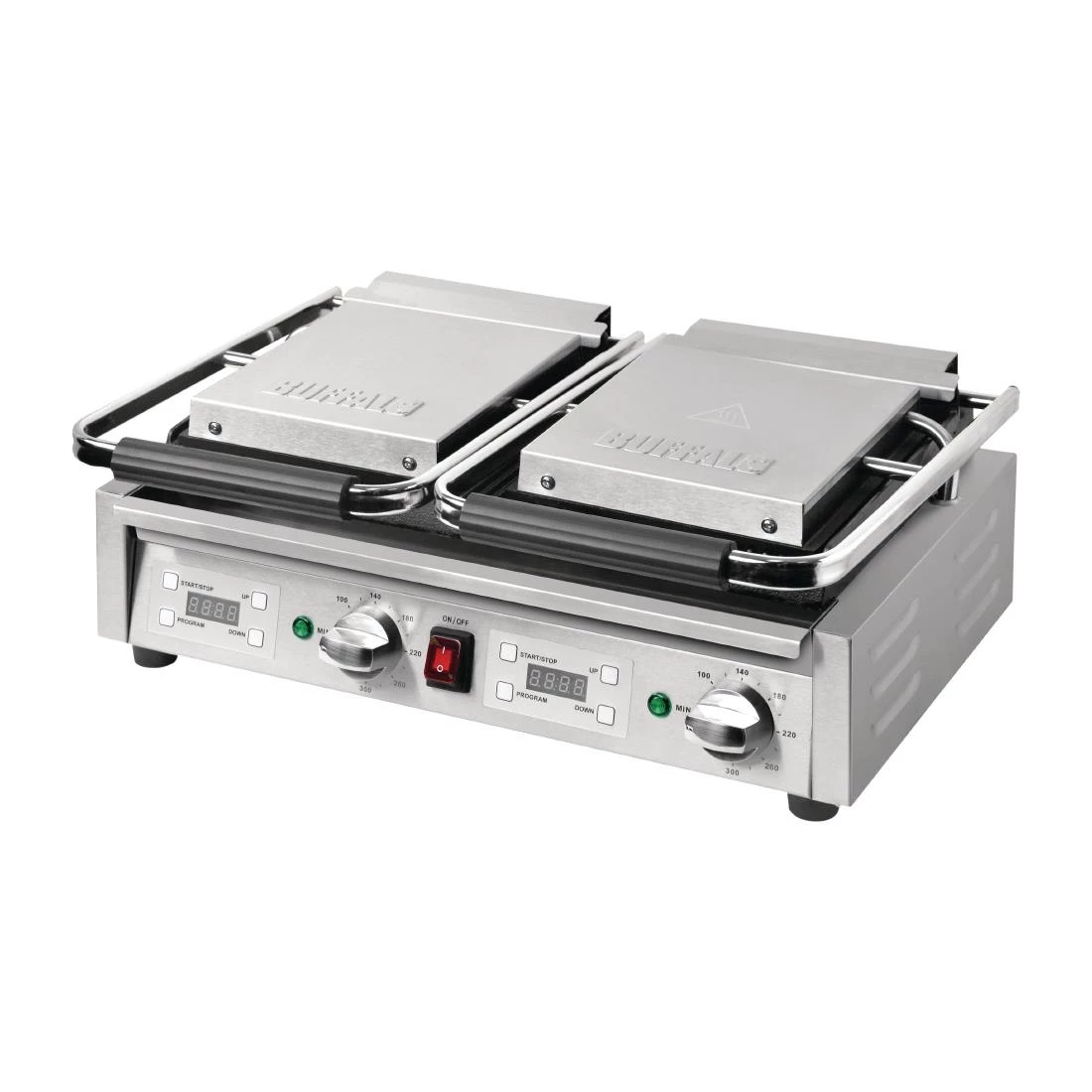 A truly versatile professional cooking appliance, the Buffalo double contact grill features heavy duty cast iron cooking plates which are both flat and ribbed on the same machine. Whether you’re cooking delicious fried eggs or tempting panini with attractive branding lines, the Buffalo removes the need for two separate appliances – perfect for mobile catering or kitchens with limited space. Designed for everyday use, the Buffalo is powerful and reliable, whilst also being easy to use and clean.