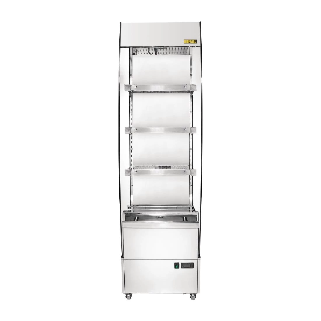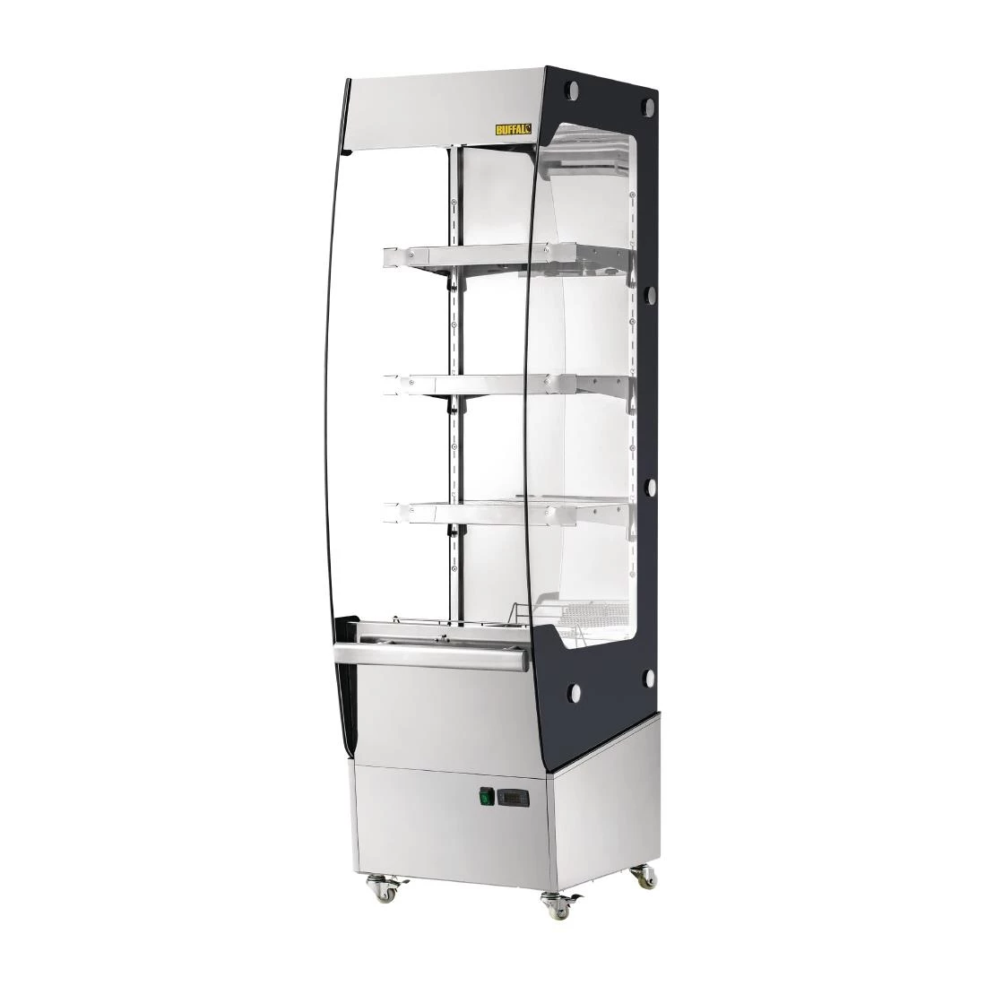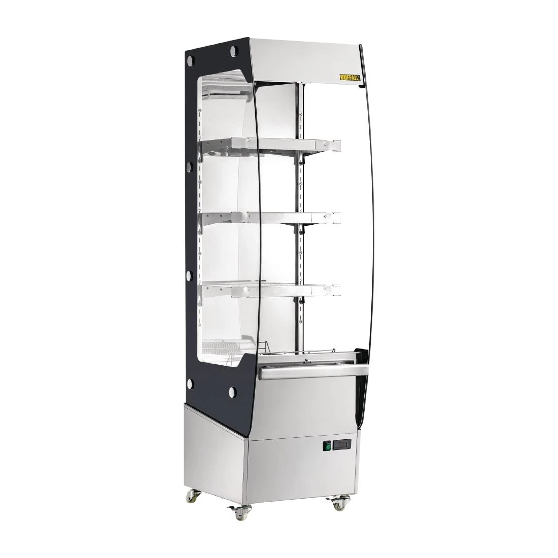 A superb quality heated food display cabinet, the Buffalo heated multideck provides a highly reliable hot food storage and merchandising solution for any retail area. With stylish curved design and a generous 220 litre capacity across three adjustable shelves, there’s plenty of room for pies, pasties, sausage rolls and more. Braked castors ensure simple positioning and cleaning, whilst the front mounted bumper helps to prevent damage from passing shopping trolleys.