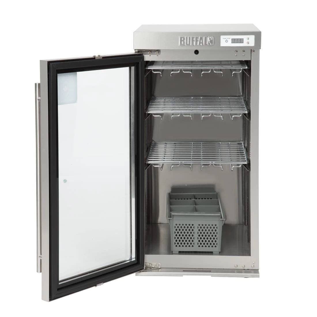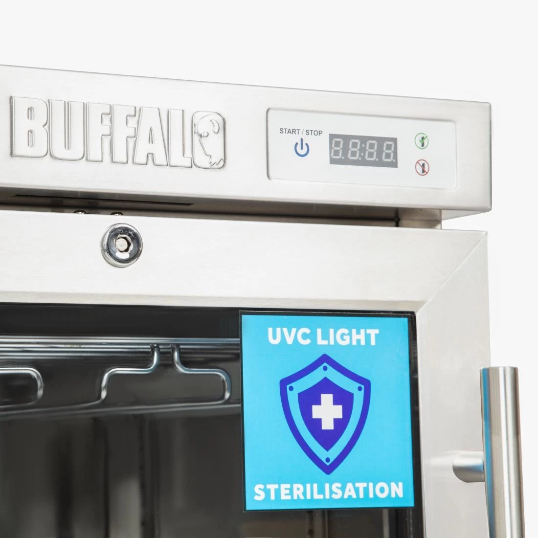 Show your customers and guests you keep your glassware, cutlery, HHTs, utensils and other similar items thoroughly sanitised with the Buffalo UVC Steriliser Cabinet. Designed for undercounter use, this unit uses two highly effective UVC lamps to destroy microorganisms quickly, without the need for chemicals or high temperatures which could otherwise damage the contents.