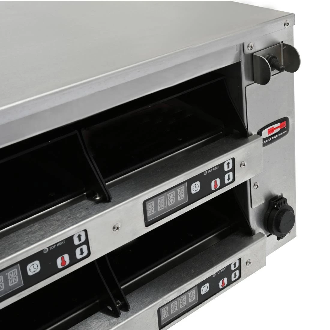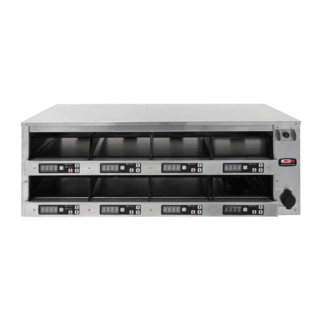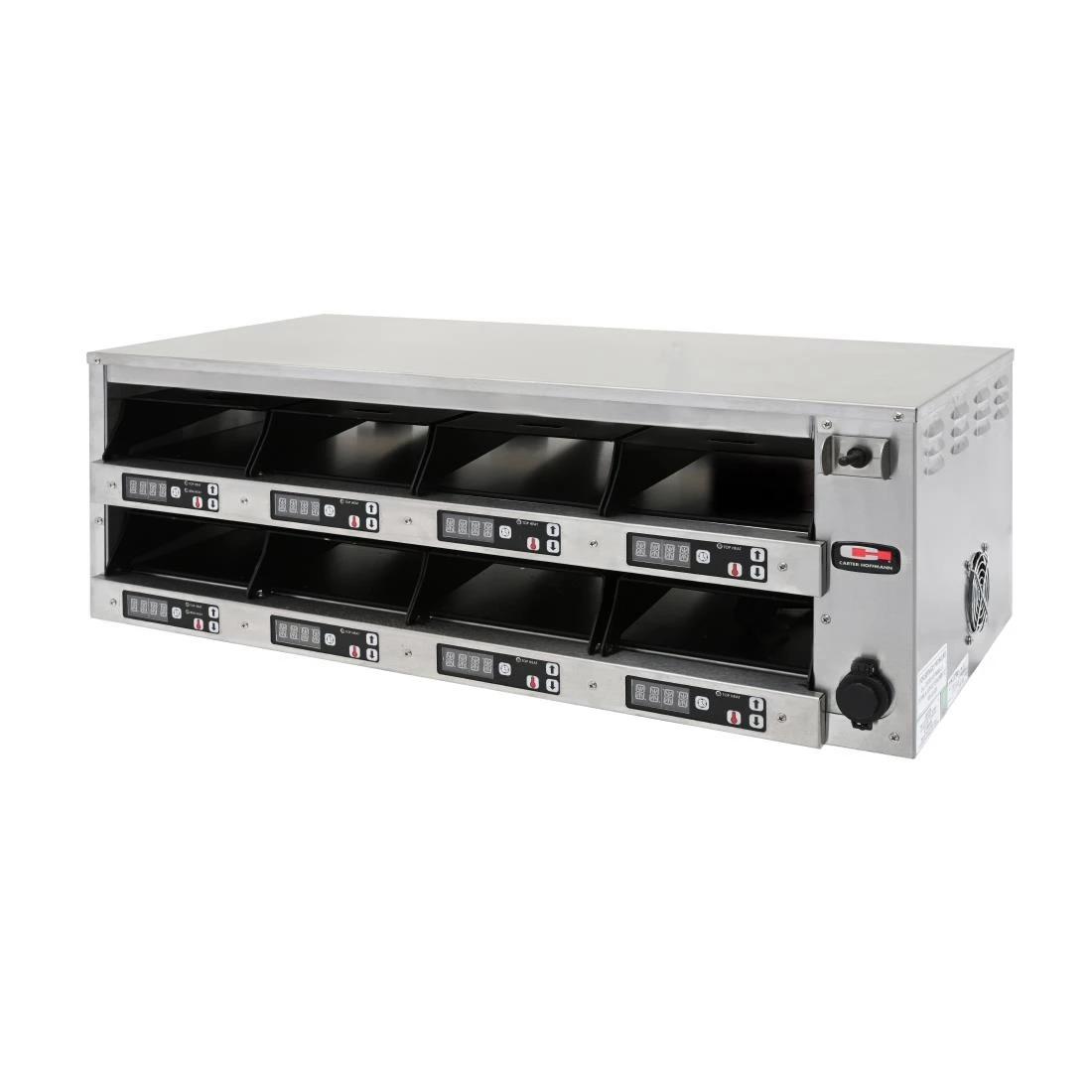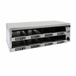The Carter-Hoffmann M series hot food modular holding cabinets feature the latest in modular holding technology. They have top and bottom heat, with separate controls, individual pan timers, alpha-numeric displays and self contained food covers. Â Programming for menu settings can be done manually or via USB port. Each pan can have up to 25 pre-programmed menu settings. Â Models can have single-sided or pass-through access to pans. Â Pass-through holding cabinet models have rear displays for temperature and time.
