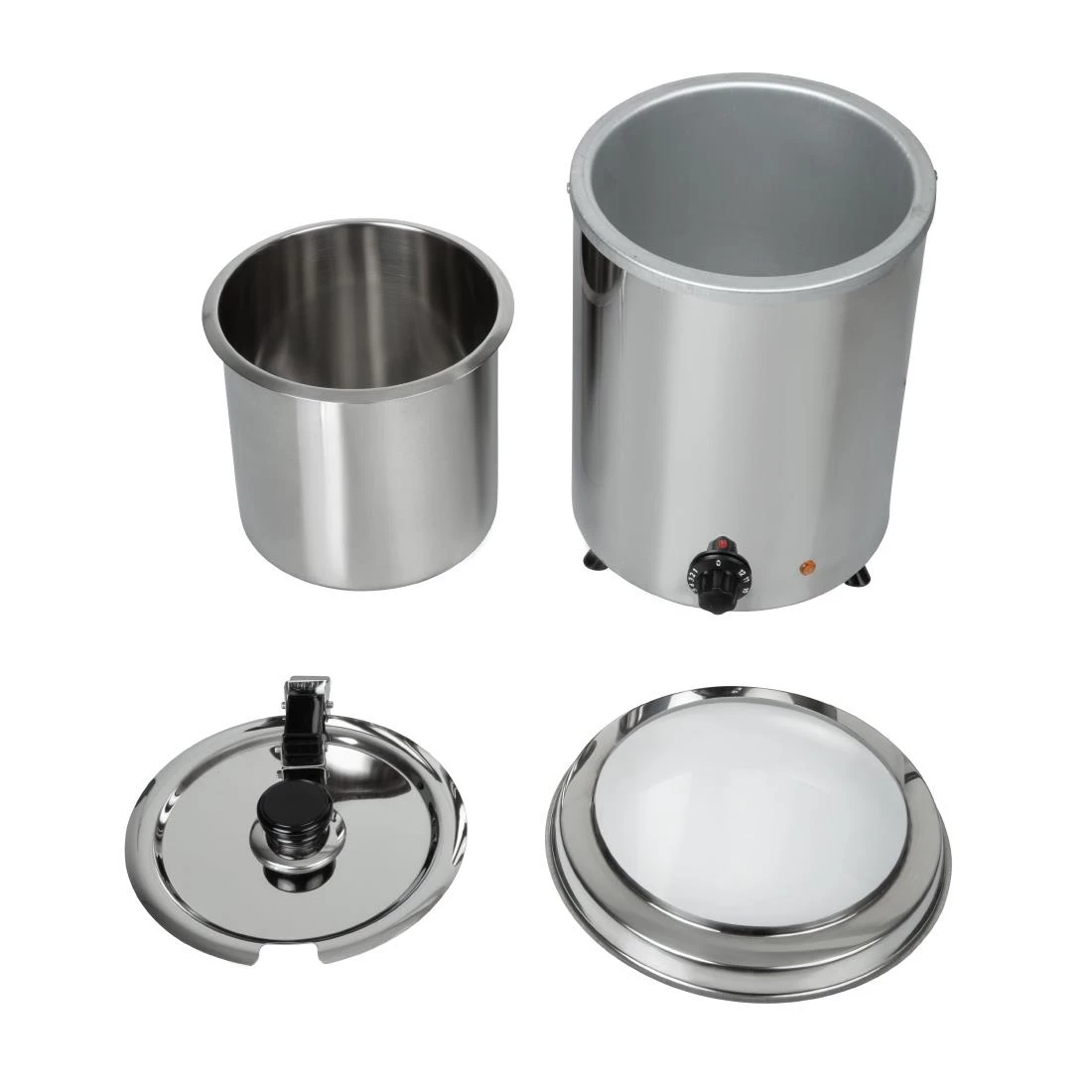 From Dualit, this high quality wet heat countertop unit ideal for serving soup, chilli, hot dogs and mulled wine in a front of house environment. Features variable heat control, failsafe override thermostat and quick heat-up long life heating elements. Stainless steel liner and hinged, removable stainless steel lid. Supplied with magnetic soup display card set.