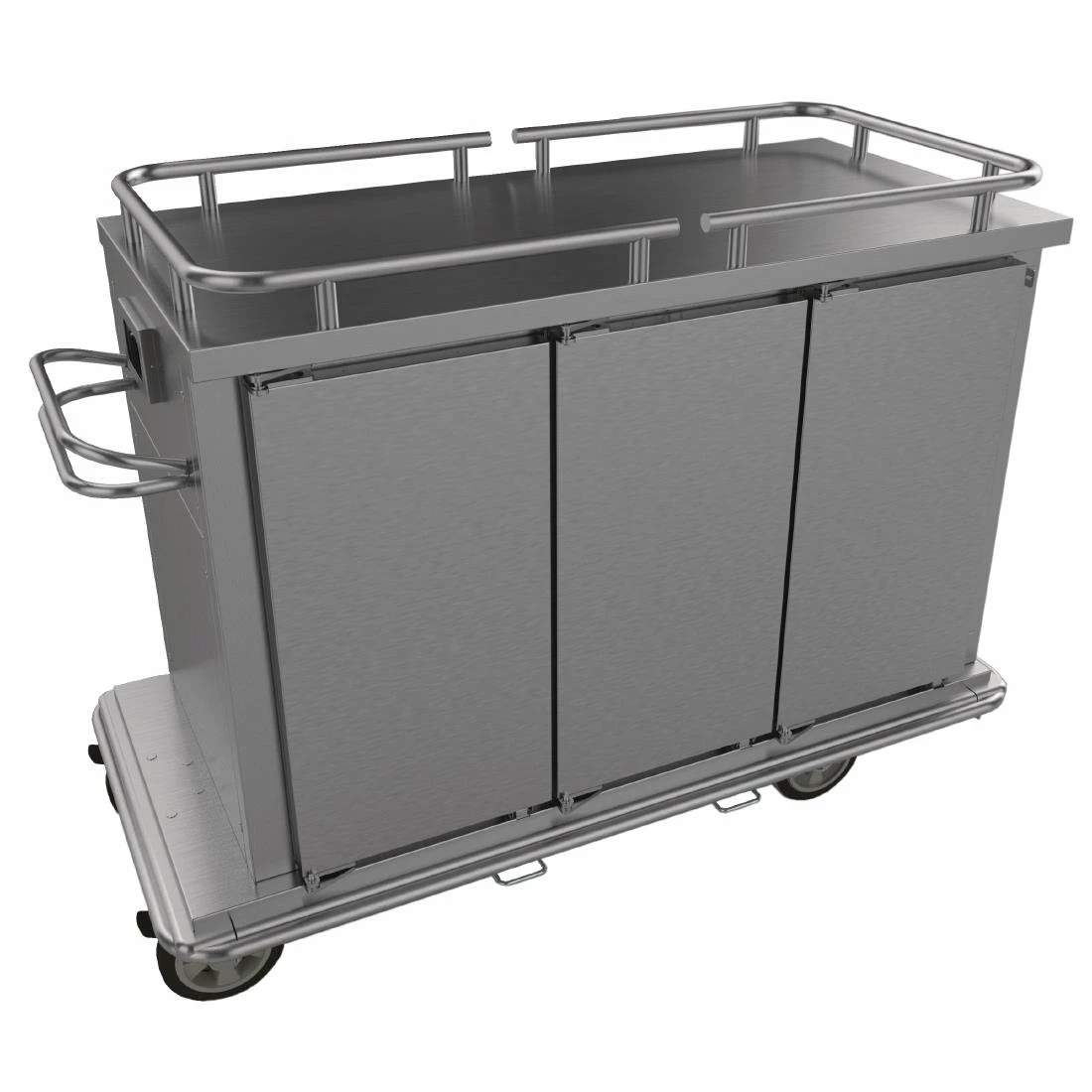 Providing the ideal hygienic food storage and transportation system, the heavy duty Falcon Chieftain T3 heated distribution trolley features a single gastronorm compatible heated chamber behind its robust doors. The food trolley includes a digital display and precise thermostat control, to ensure that the contents are kept at the required temperature, whilst the advanced thermal insulation ensures that the heat is retained and energy consumption is minimised. This model can accommodate up to 30 full sized gastronorm pans and features a top mounted rail to assist manoeuvrability.