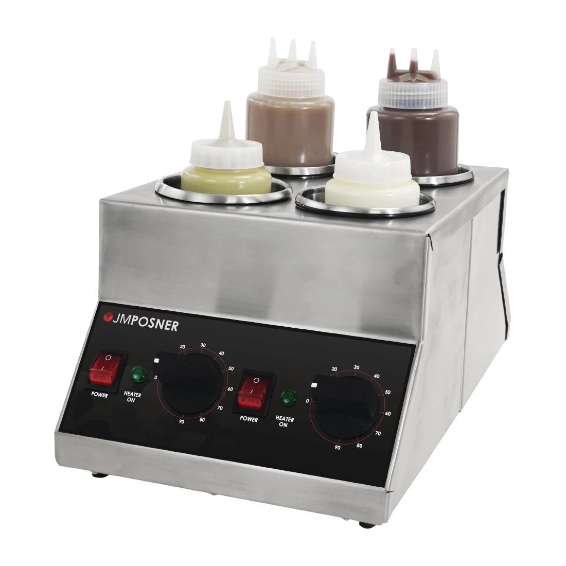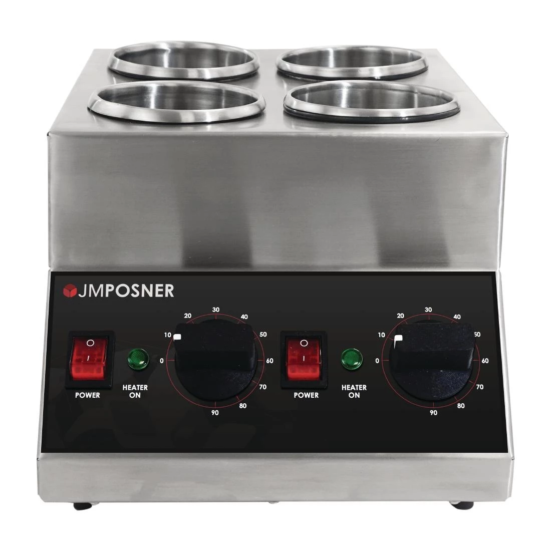 This quadruple sauce bottle warmer maintains a sauces heat precisely through its 0°C to 90°C control. This allows for deliciously hot sauce every time to customers. This is perfect for kiosks, cafes, buffets, stalls and any type of restaurant serving food. Excellent to use as it cooks real chocolate sauce for pancakes, ice cream, waffles and crepes, rather than traditional chocolate sauce. Can be used for any sauce, like hot cheese sauce for nachos and chips or for barbeque or chilli sauce. It gives your customers a better taste and experience.