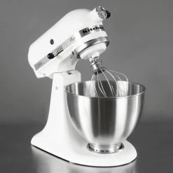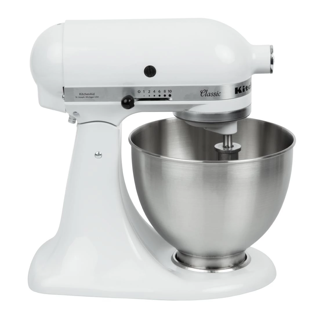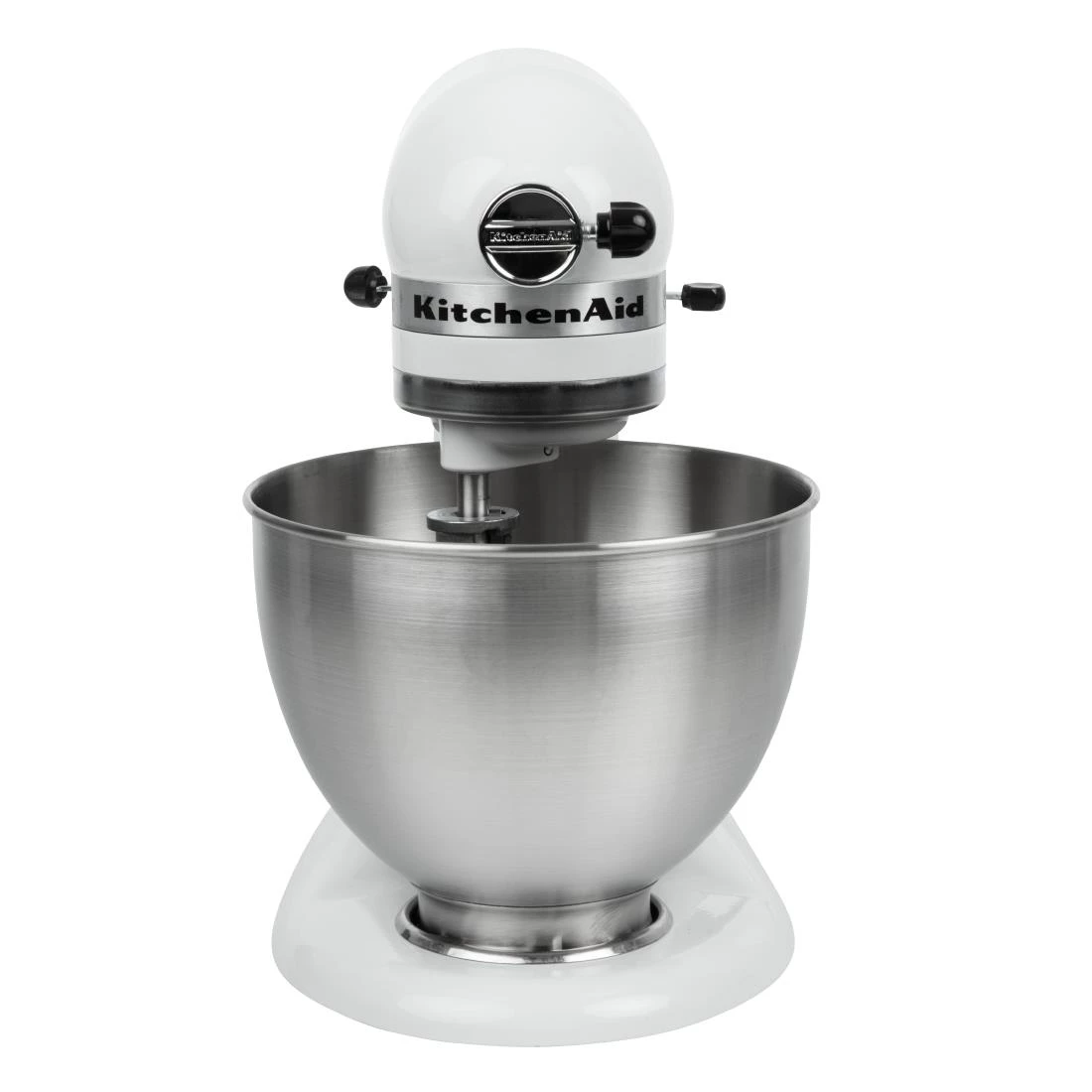 Want to mix ingredients as quickly and efficiently as the pros? Then this 4.3Ltr white KitchenAid K45 Classic tilt-head stand mixer is a must-have! The 10-speed power control allows for fast yet thorough mixing, whilst its direct drive motor ensures a quiet, reliable and durable performance. This will help to speed up your prep times – all while keeping noise to a minimum!