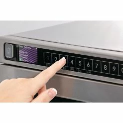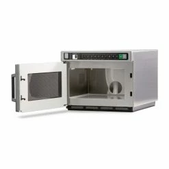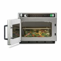 Cook your dishes quicker and more evenly with a DEC21E2 Menumaster heavy duty compact microwave, a powerful cooking solution which uses unique energy distribution to ensure every meal receives consistent heat to its very core. The interior chamber can accommodate a standard half pan whilst the quantity pad inside automatically calculates the cooking times for bulk batches, making this microwave suitable for high paced kitchens. As a compact machine, it minimises installation cost thanks to vent-free operation that removes the needs for potentially expensive overhead extraction. The control panel on the device is streamlined and easy to operate, with four stages of cooking and up to 100 personalised settings to suit your menu.