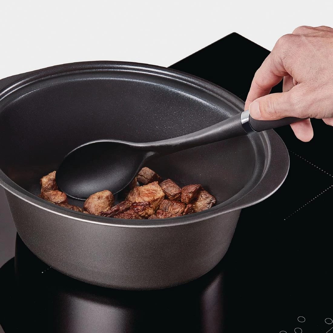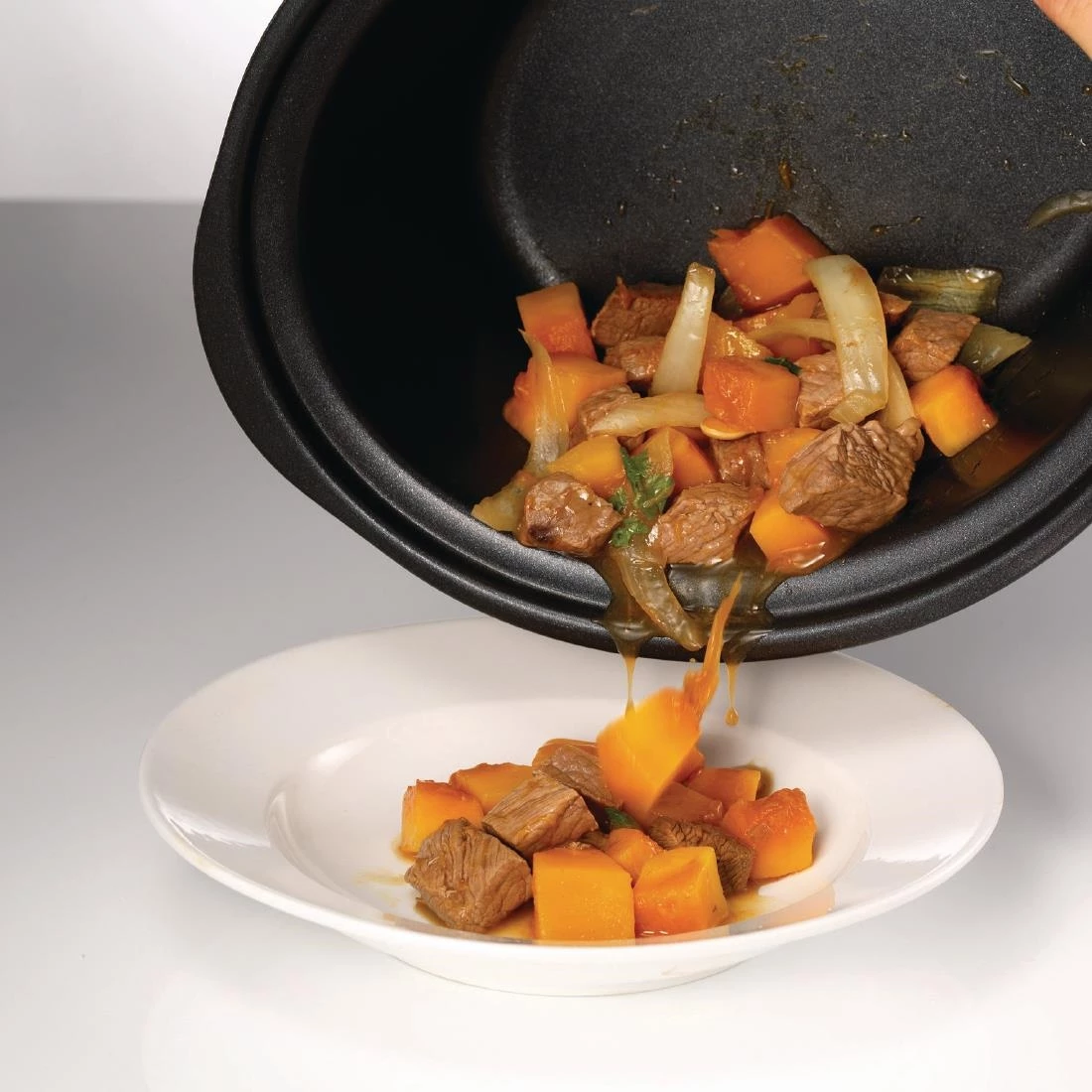 - Removable hob-proof aluminium pot – sear and stew in the same pot, doubles as a serving dish