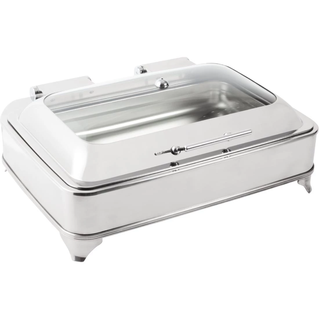 Attractive food presentation method, ideal for buffet use, featuring a top quality stainless steel construction with a glass section in the lid allowing the food to be displayed whilst covered. This 8 litre rectangular chafer is safer to use than traditional chafers with no naked flames, the hydraulic lid opening and closing system also offers improved safety and easier use. With a wet heat operation, it comes supplied with a pan.