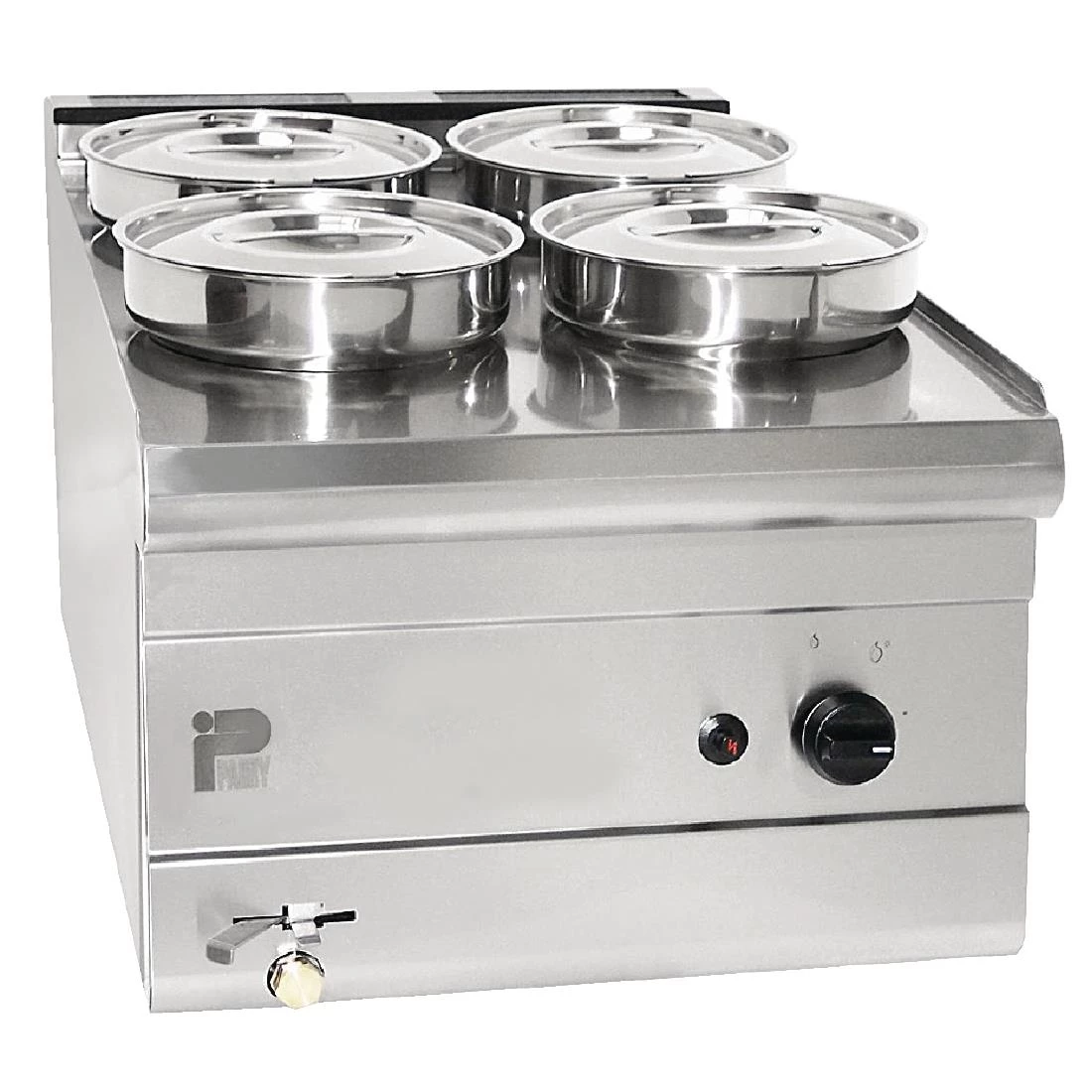 Moderating heat gently through the interior water bath, this Parry 600 Series Bain Marie comes readily supplied with four circular pots for storing of hot food and vegetables, as well as for the preparation of sauces and custards for use in buffets and self service environments. The temperature is easily modified through the front manual dial to complement your choice of food, soup or sauce.