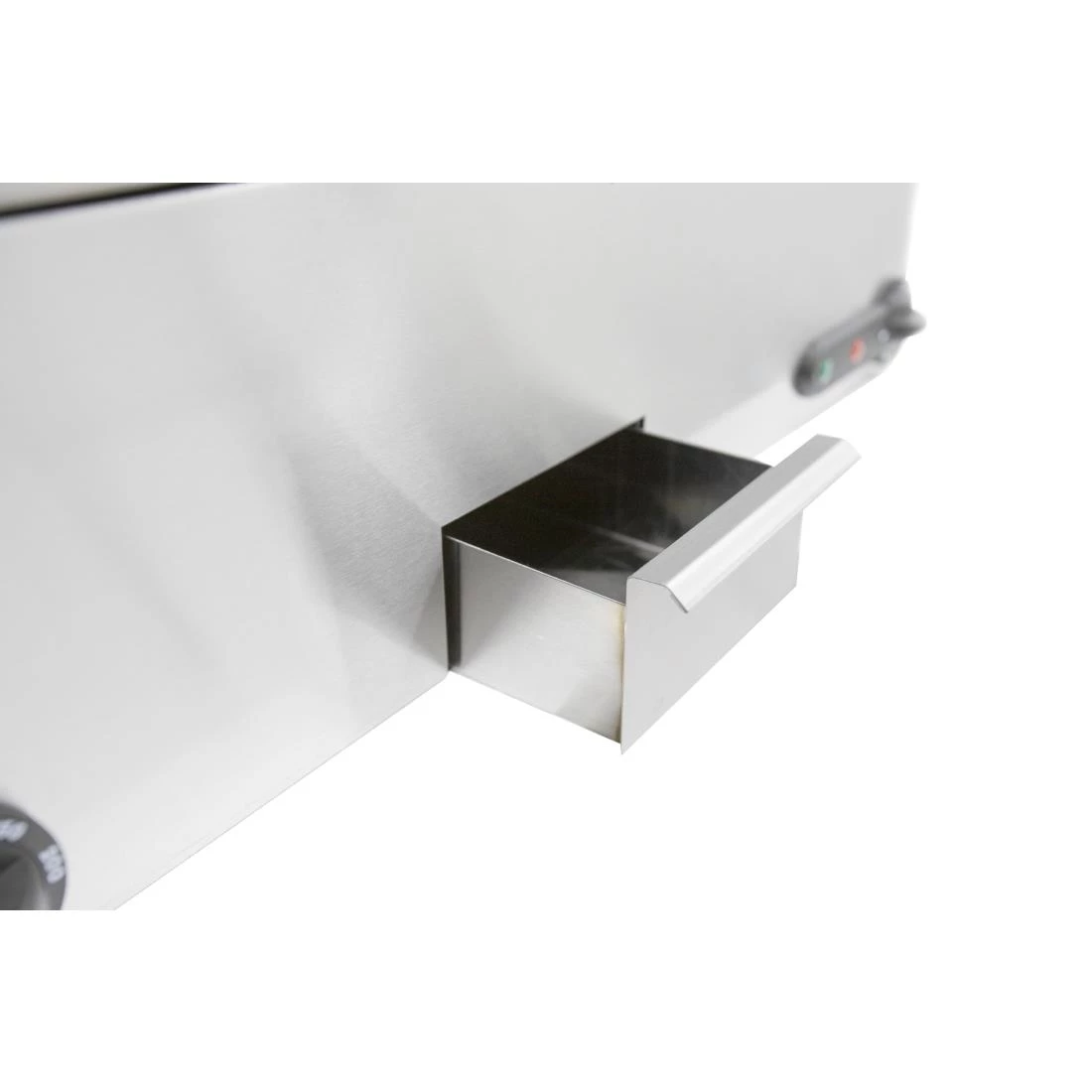 The cooking plate itself is expertly polished for optimal heat distribution and retention – meaning even when cold meats are placed on the plate, temperature is quickly recovered, maximising the number of cooking cycles possible. And thanks to the front-mounted drain, any grease or fats are easily channelled away from the food into a handy removable fat collection drawer.