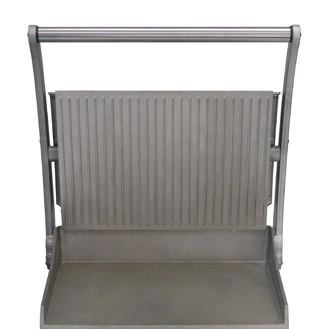 - A counter-balanced top plate and an arched handle makes operating the grill station easy