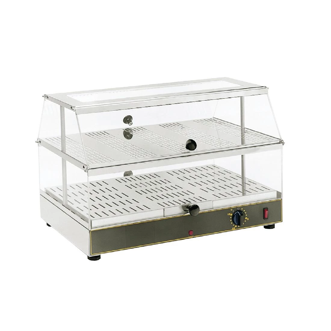 Provide your heated pastries, croissants, pasties and pies with a thermostatically controlled and humidified environment and visually showcase your stock in this Roller Grill Heated Food Display. With two shelves of merchandising space for you to arrange your own assortment of hot foods, this unit can be versatile in its application due to the addition of both front and rear opening doors, making it suitable for both self and assisted service catering.