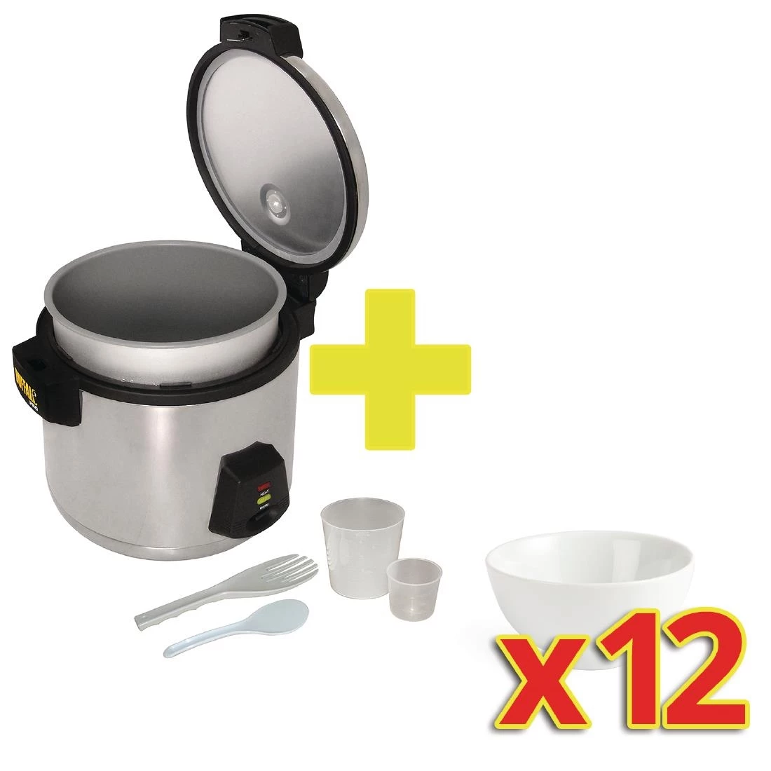This special offer set also comes with twelve stackable 5″ porcelain rice bowls for serving to customers, each with strengthened rolled edges to resist chipping.