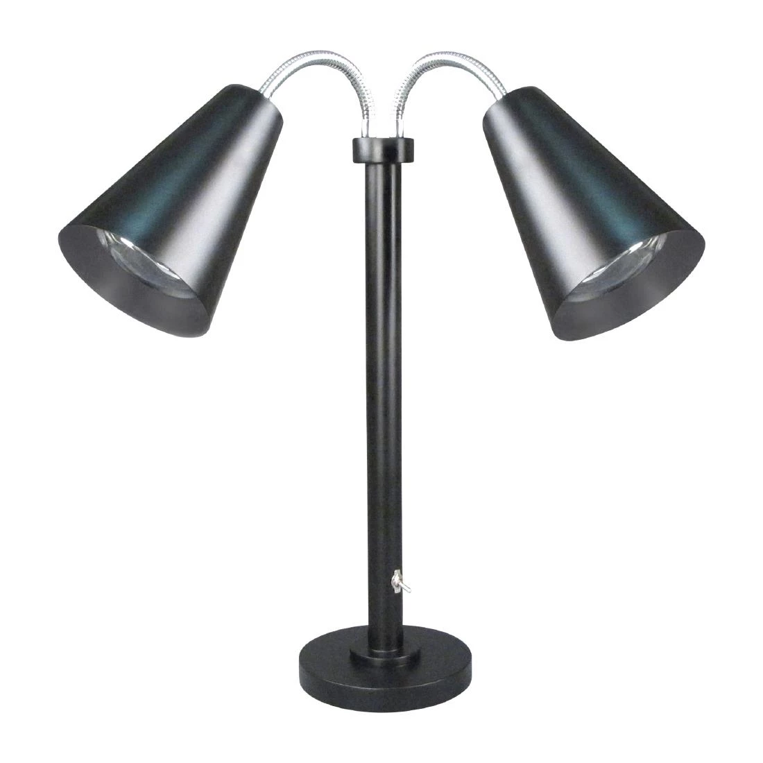 Double headed heat lamp that is designed to keep buffet food stuff warm and look good at the same time.
